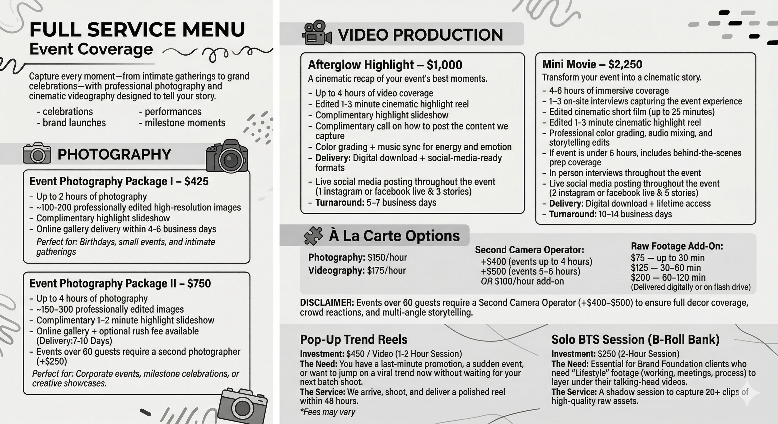 Note: Client must provide B-Roll for recap videos or book a Solo BTS add-on.